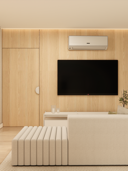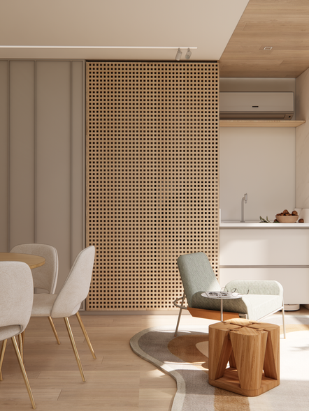 O apartamento de 112m² em Blumenau conta com uma suíte master e dois escritórios. Um grande espaço de estar e viver contribui para os momentos em família.